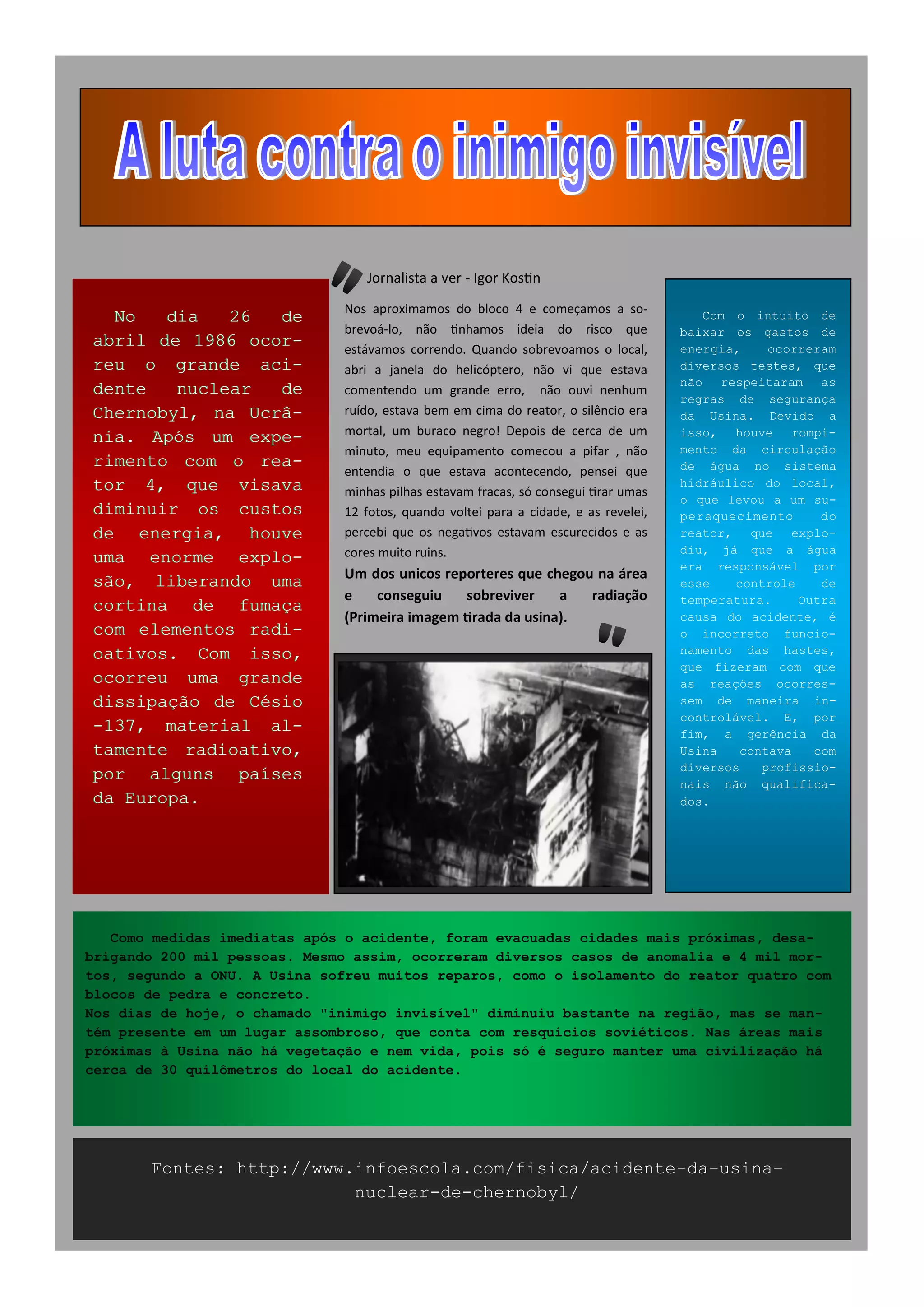 O acidente nuclear de Chernobyl ocorreu em 26 de abril de 1986 na Ucrânia devido a testes que não respeitaram protocolos de segurança e causaram uma explosão no reator 4, liberando radiação sobre a Europa. O jornalista Igor Kostin foi um dos únicos repórteres a chegar na área e sobreviver à radiação, tirando as primeiras fotos do local.