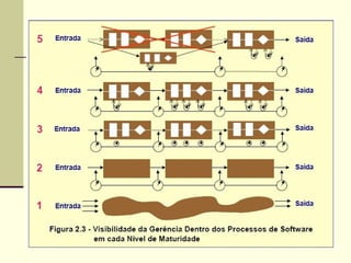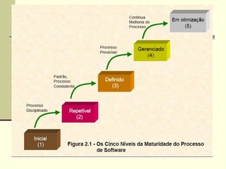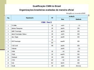 O documento aborda normas e modelos de qualidade de software, destacando o modelo CMM (Capability Maturity Model), que avalia a maturidade dos processos de software em cinco níveis. Também menciona a evolução do CMM, sua aplicação em diversas indústrias, e os benefícios de empresas que adotam tais práticas de qualidade. Além disso, o texto inclui informações sobre o processo de certificação, custos e etapas necessárias para obter a certificação CMMI.
