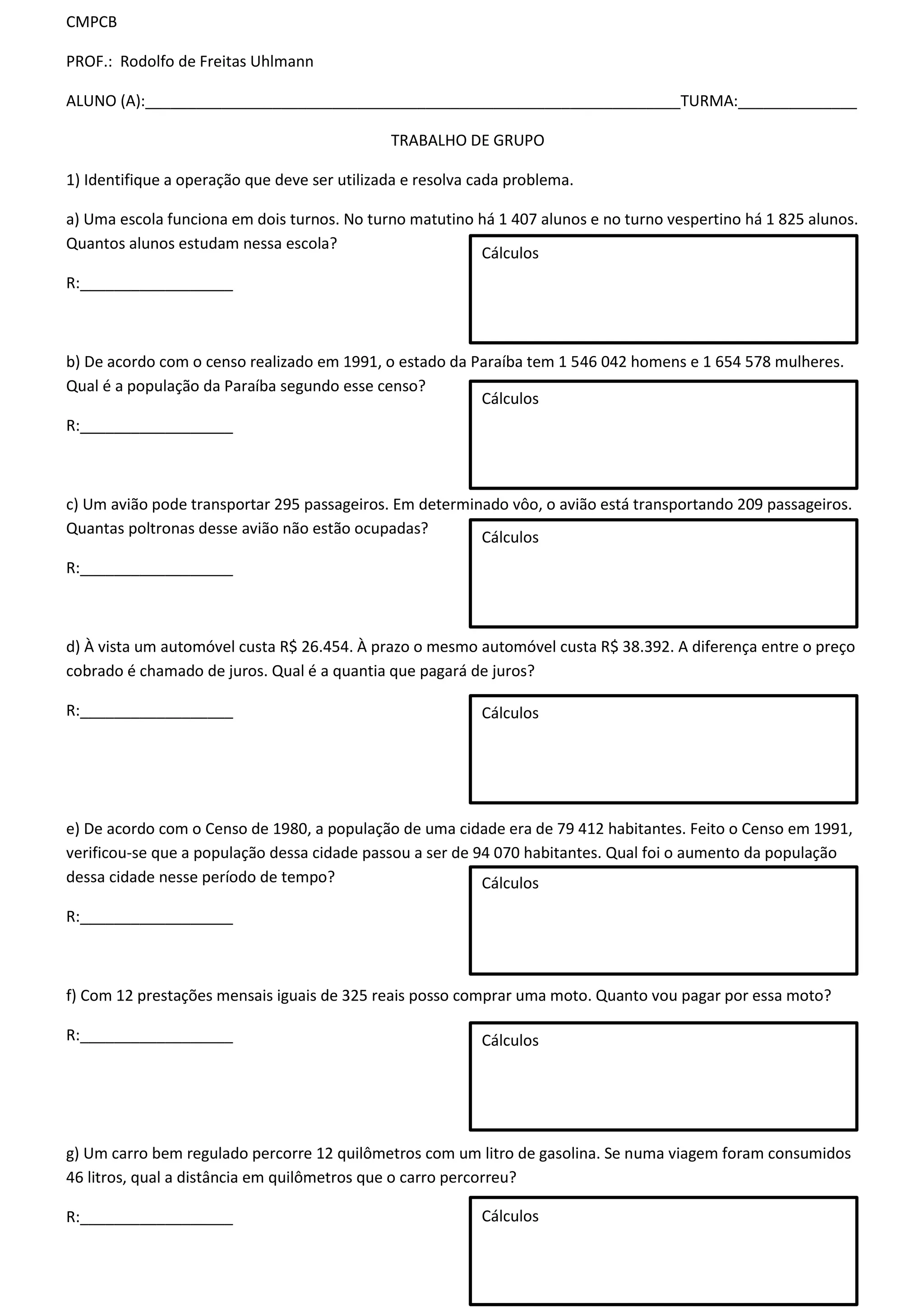 O documento apresenta uma série de problemas matemáticos envolvendo operações como soma, subtração, multiplicação e divisão. Os problemas incluem cálculos populacionais, financeiros e geométricos.