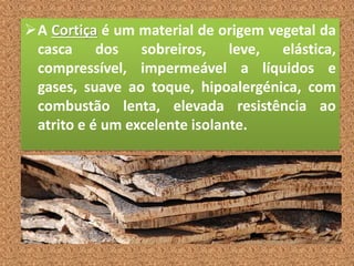A cortiça é um material leve, elástico e isolante produzido a partir da casca do sobreiro, contendo muitas células cheias de uma substância chamada suberina que impede a passagem de líquidos e gases. A cortiça é amplamente utilizada em rolhas, pavimentos, calçados e na tecnologia devido às suas propriedades únicas.