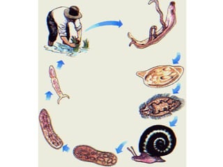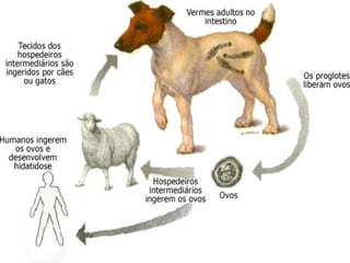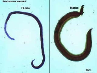 O documento discute esquistossomose, uma doença causada pelo parasita Schistosoma mansoni que afeta o fígado, intestinos e vias urinárias. Também aborda teníase e cisticercose, doenças causadas por parasitas da família Taenidae, e hidatidose, causada pelo Echinococcus granulosus. Por fim, apresenta características gerais e a anatomia e reprodução dos nematelmintos.