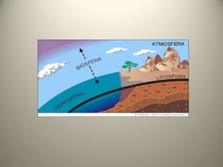 O documento descreve três camadas da Terra: a hidrosfera, litosfera e atmosfera. A hidrosfera é o sistema formado pelas águas na superfície e subsolo da Terra. A litosfera é a camada sólida externa composta por rochas e minerais, fragmentada em placas tectônicas onde ocorrem fenômenos geológicos. A atmosfera é a camada de gases que envolve a Terra e fornece proteção contra radiação, regula a temperatura e contém oxigên