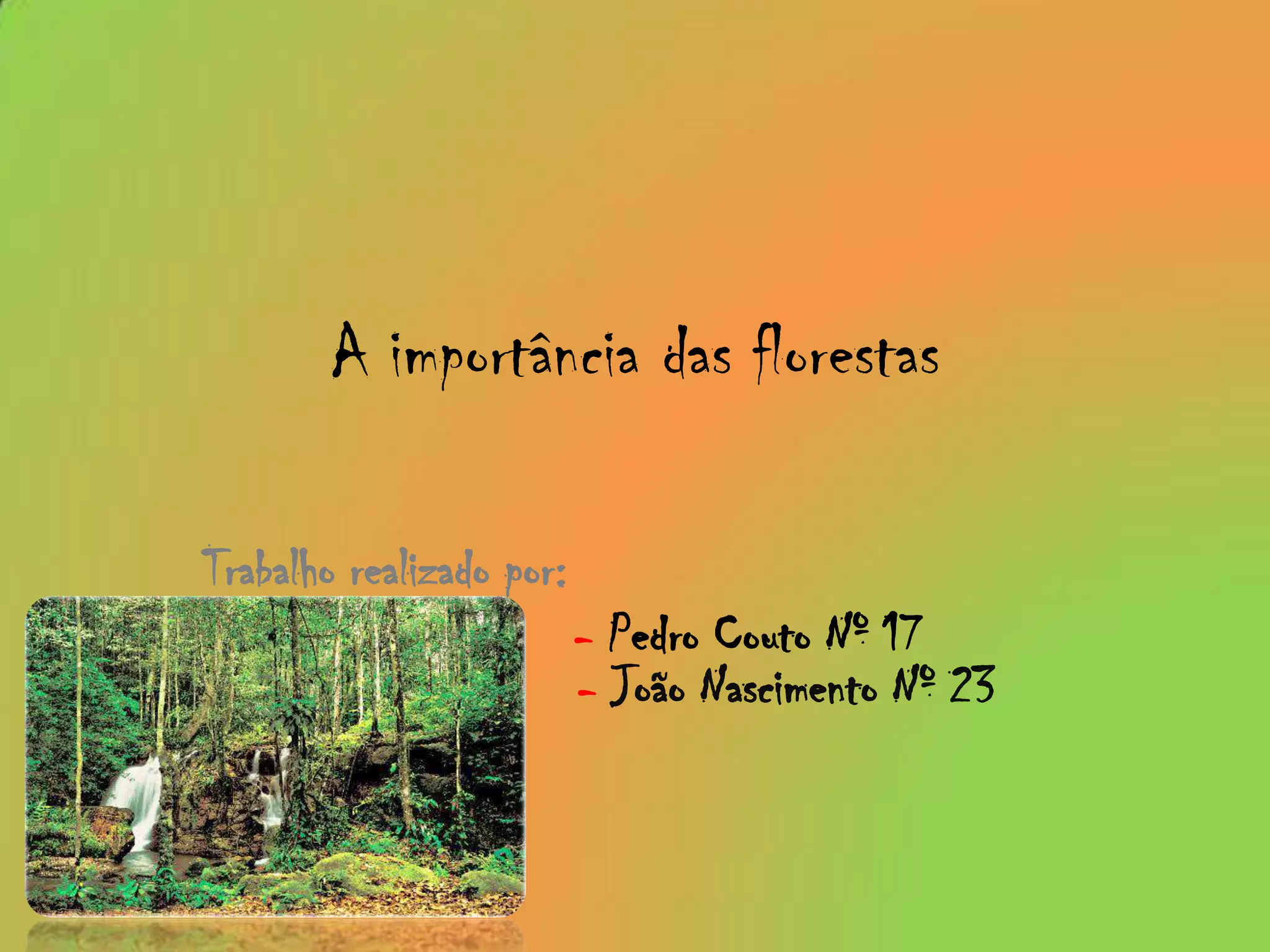 Este documento discute a importância das florestas para a vida, como elas melhoram a qualidade do ar e da água e protegem o solo. Ele também explica como as árvores ajudam a regular o clima e sustentam a biodiversidade. Além disso, o documento descreve como as florestas apoiam atividades econômicas e fornecem empregos.
