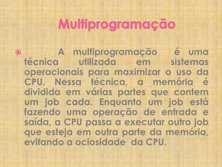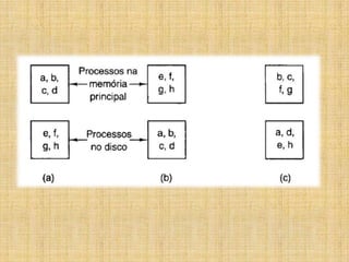 O documento discute diferentes modelos de agendamento de processos em sistemas operacionais, incluindo agendamento garantido, por sorteio, de tempo real e de dois níveis. O objetivo do agendamento é maximizar a utilização da CPU alternando entre processos de forma justa e previsível.