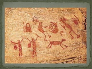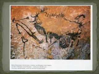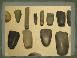 O documento descreve o período Paleolítico e Neolítico da pré-história, quando os primeiros humanos eram caçadores-coletores nômades e desenvolveram ferramentas de pedra. O Paleolítico durou de 2,5 milhões a 10 mil anos atrás e foi sucedido pelo período Neolítico com o surgimento da agricultura e assentamentos permanentes.