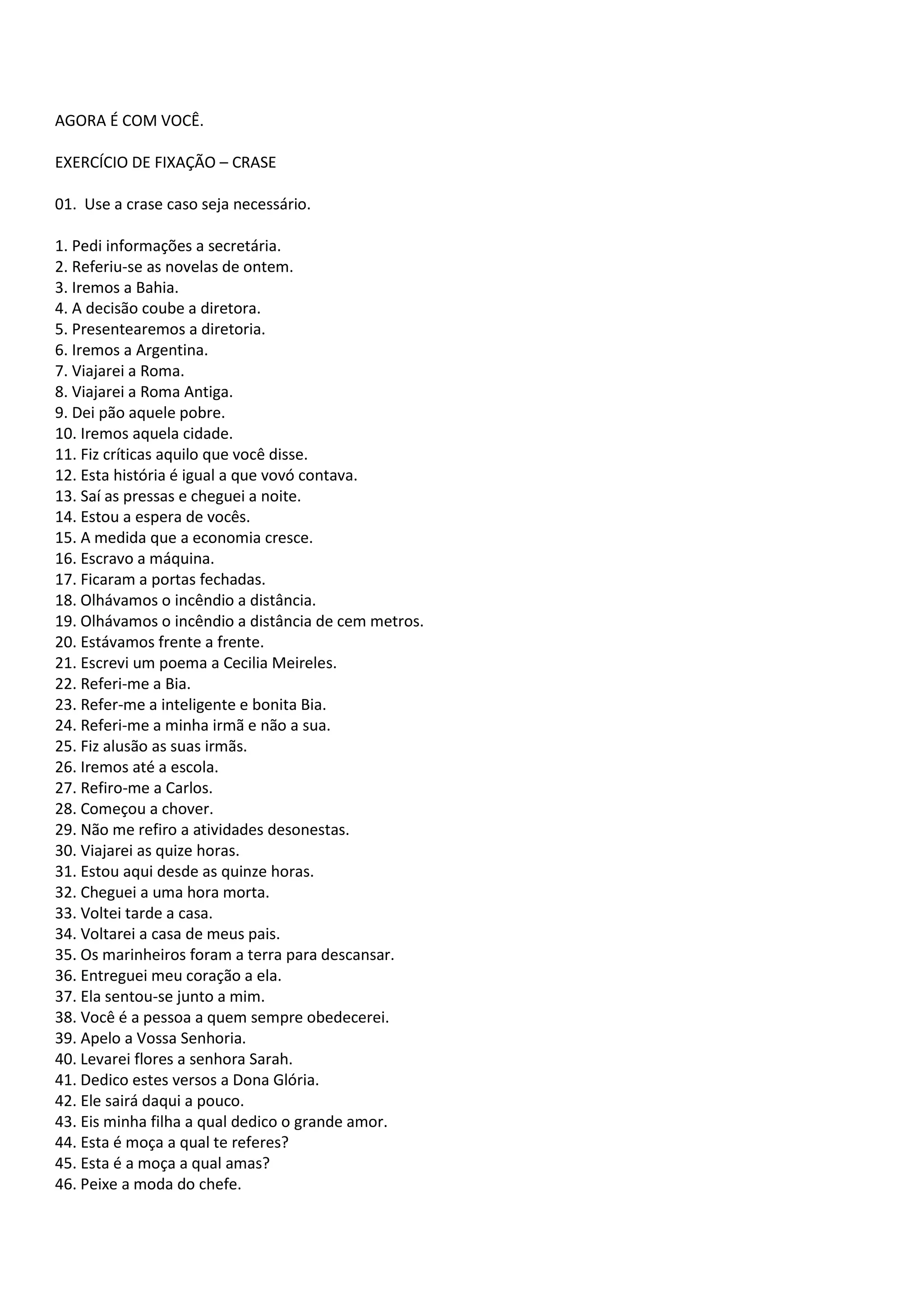 AGORA É COMVOCÊ.<br />EXERCÍCIO DE FIXAÇÃO – CRASE<br />01. Use a crase caso seja necessário.<br />1. Pedi informações a secretária.<br />2. Referiu-se as novelas de ontem.<br />3. Iremos a Bahia.<br />4. A decisão coube a diretora.<br />5. Presentearemos a diretoria.<br />6. Iremos a Argentina.<br />7. Viajarei a Roma.<br />8. Viajarei a Roma Antiga.<br />9. Dei pão aquele pobre.<br />10. Iremos aquela cidade.<br />11. Fiz críticas aquilo que você disse.<br />12. Esta história é igual a que vovó contava.<br />13. Saí as pressas e cheguei a noite.<br />14. Estou a espera de vocês.<br />15. A medida que a economia cresce.<br />16. Escravo a máquina.<br />17. Ficaram a portas fechadas.<br />18. Olhávamos o incêndio a distância.<br />19. Olhávamos o incêndio a distância de cem metros.<br />20. Estávamos frente a frente.<br />21. Escrevi um poema a Cecilia Meireles.<br />22. Referi-me a Bia.<br />23. Refer-me a inteligente e bonita Bia.<br />24. Referi-me a minha irmã e não a sua.<br />25. Fiz alusão as suas irmãs.<br />26. Iremos até a escola.<br />27. Refiro-me a Carlos.<br />28. Começou a chover.<br />29. Não me refiro a atividades desonestas.<br />30. Viajarei as quize horas.<br />31. Estou aqui desde as quinze horas.<br />32. Cheguei a uma hora morta.<br />33. Voltei tarde a casa.<br />34. Voltarei a casa de meus pais.<br />35. Os marinheiros foram a terra para descansar.<br />36. Entreguei meu coração a ela.<br />37. Ela sentou-se junto a mim.<br />38. Você é a pessoa a quem sempre obedecerei.<br />39. Apelo a Vossa Senhoria.<br />40. Levarei flores a senhora Sarah.<br />41. Dedico estes versos a Dona Glória.<br />42. Ele sairá daqui a pouco.<br />43. Eis minha filha a qual dedico o grande amor.<br />44. Esta é moça a qual te referes?<br />45. Esta é a moça a qual amas?<br />46. Peixe a moda do chefe.<br />47. Peixe a Marisa Monte.<br />02. Justifique o emprego das expressões grifadas<br />abaixo:<br />a) Não ás sessões noturnas!<br />b) Não a sessões noturnas!<br />c) Não há sessões noturnas.<br />d) Ele saiu daqui há pouco.<br />e) Ele sairá daqui a pouco.<br />