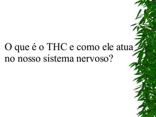 O documento discute o THC, o principal componente psicoativo da maconha. Explica que o THC atua nos receptores do cérebro e substitui um neurotransmissor, alterando os impulsos nervosos e causando efeitos como alucinações. Também discute os possíveis usos médicos do THC, mas reconhece que pode ter efeitos colaterais como danos pulmonares e cognitivos quando usado em excesso.