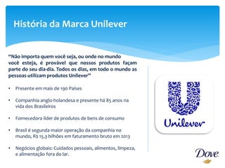 O documento resume a história da marca Dove no Brasil, seu posicionamento de valorizar a autoestima feminina e campanha "Real Beleza". Dove é uma marca global de cuidados pessoais presente em mais de 90 países que cresceu significativamente após campanha viral mostrando mulheres reais.
