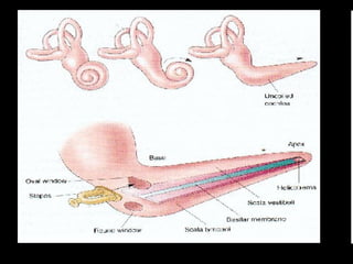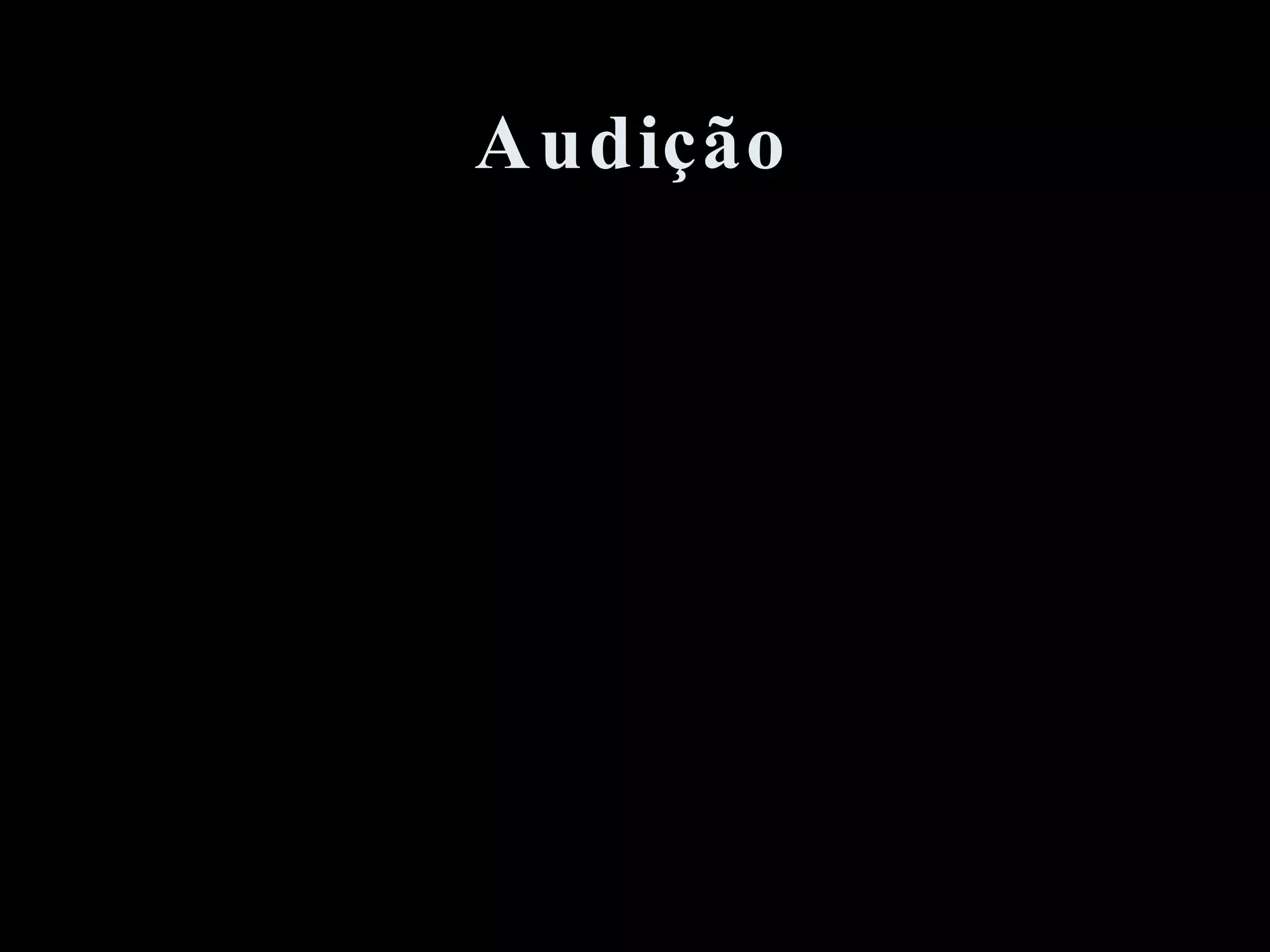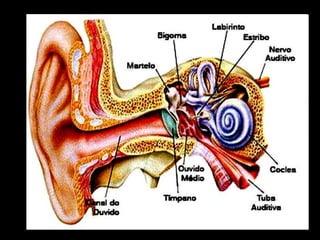 O documento descreve a estrutura e o funcionamento da audição humana. A orelha é dividida em três partes - externa, média e interna - que captam as vibrações sonoras e as transformam em impulsos nervosos enviados ao cérebro para interpretação. As vibrações são captadas pelo pavilhão auricular e conduzidas através dos ossículos e da cóclea, onde células ciliadas as transformam em sinais nervosos.