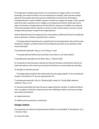 O documento fornece uma introdução sobre os principais conceitos e formas de energia, incluindo energia potencial, cinética, mecânica, hidrelétrica, química, nuclear, eletromagnética e radiante. Resume as definições dessas formas de energia e como uma pode ser convertida em outra.