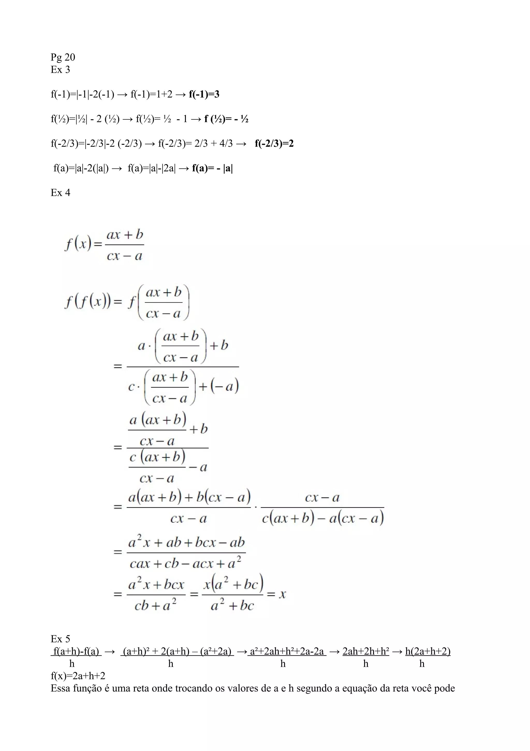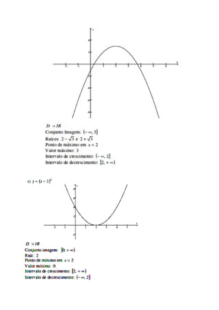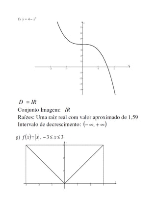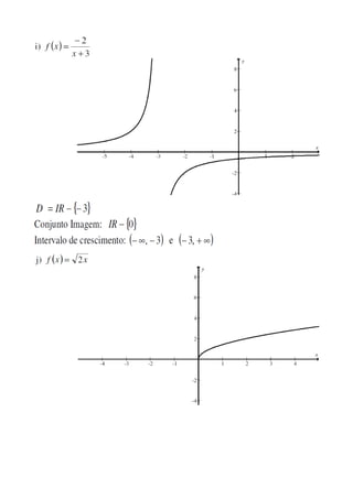 O documento apresenta exemplos de funções e cálculos com funções. Nas primeiras páginas, há exercícios resolvidos sobre domínio e imagem de funções. Posteriormente, exemplos envolvendo derivadas, integrais e funções periódicas são mostrados.