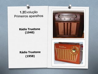 O documento resume a história do rádio e da televisão, incluindo os principais inventores como Clerk Maxwell, Rodolph Hertz, Marconi, e Philo Farnsworth. Detalha a evolução dos aparelhos de rádio e TV, desde os primeiros modelos até as versões digitais atuais, e descreve os principais sistemas de transmissão como PAL e NTSC.
