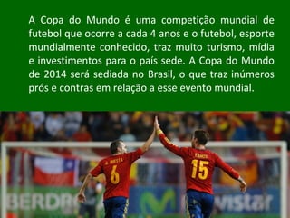 O documento discute os prós e contras da Copa do Mundo de 2014 no Brasil. Apresenta os benefícios como turismo, mídia e investimentos, mas também os custos de infraestrutura e possibilidade de corrupção. Sugere que o lucro seja investido em educação, saúde e planejamento de futuros eventos.