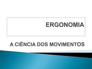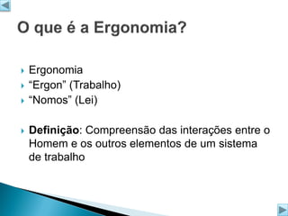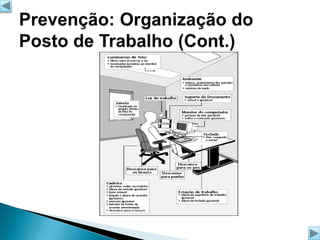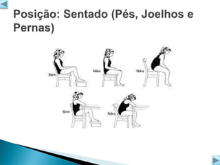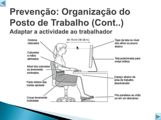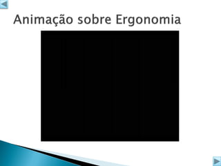 Este documento discute a ergonomia e as más condições de trabalho que podem levar a doenças. Ele fornece exemplos de más condições ambientais e ergonômicas no trabalho e sintomas associados. O documento também dá dicas sobre como melhorar a postura, alongar regularmente e fazer pequenas pausas para prevenir problemas de saúde relacionados ao trabalho.
