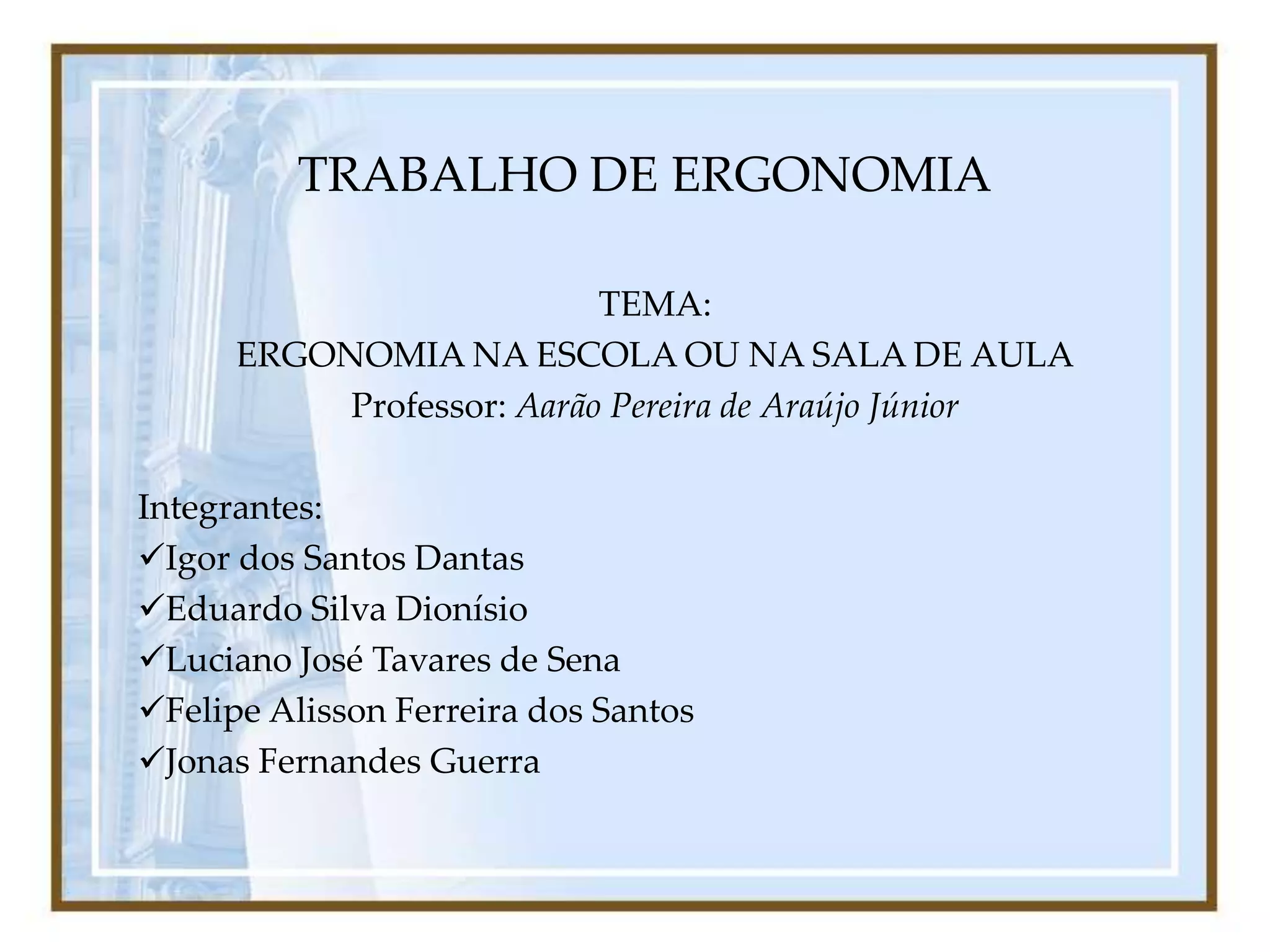 O documento discute como a ergonomia na escola e na sala de aula pode melhorar o desempenho educacional. Ele aborda como fatores como mobiliário, iluminação e ventilação podem causar desconforto físico nos alunos e como soluções ergonômicas podem ajudar a resolver esses problemas, resultando em benefícios para a saúde e aprendizagem dos estudantes.