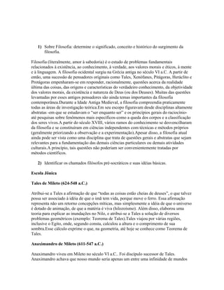 O documento discute a história e conceitos fundamentais da filosofia, incluindo seu surgimento na Grécia antiga e os principais filósofos pré-socráticos como Tales de Mileto, Anaximandro, Anaxímenes, Parmênides e Heráclito. Também aborda as escolas filosóficas da Jônia, Itália e Eléia, além de conceitos como mito e alegoria da caverna de Platão.