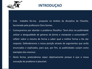 O documento analisa a ética da utilização da desigualdade de gêneros na publicidade como forma de manipulação do consumidor. Argumenta que essa manipulação é imoral, uma vez que ignora os direitos ao pensamento crítico e perpetua estereótipos prejudiciais, exacerbando preconceitos de gênero. Conclui que tal prática é inaceitável e deve ser evitada, pois envolve o uso indevido de estereótipos sociais e faz do ser humano um objeto de consumo.