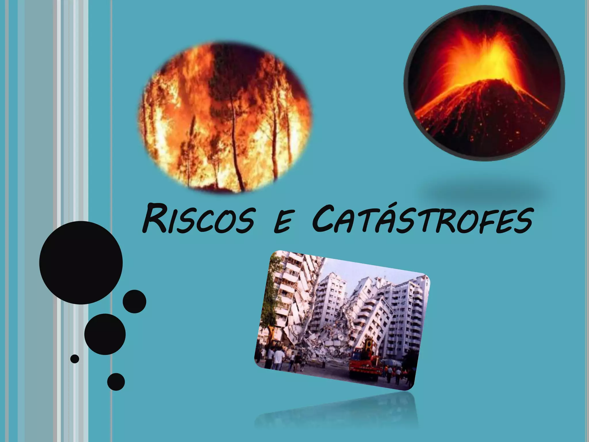Este documento discute vários tipos de riscos e catástrofes naturais, incluindo tempestades, sismos, erupções vulcânicas, tsunamis, avalanches, desertificação, incêndios florestais, vagas de frio e calor, e movimentos de vertente. Ele fornece detalhes sobre as causas e consequências destes eventos, assim como estratégias de prevenção.