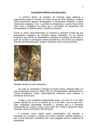 1) O Ciclo da Borracha foi importante para a história econômica e social do Brasil, impulsionando o desenvolvimento de cidades na Amazônia e criando o estado do Acre. 2) A primeira fábrica de borracha surgiu na França em 1803, mas a atividade de extração se desenvolveu na Amazônia a partir da seringueira. 3) Durante a 2a Guerra, o Brasil e os EUA fizeram um acordo para aumentar a produção de borracha, lançando a "Batalha da Borracha" que mobiliz