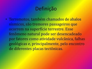 Terremotos são tremores na superfície terrestre causados principalmente pelo encontro de placas tectônicas. Os países mais atingidos ficam nas zonas de convergência de placas, como Japão, Indonésia e Estados Unidos. Cerca de 300 mil terremotos ocorrem globalmente a cada ano, dos quais 100 mil são percebidos e pelo menos mil causam danos.