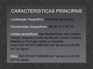 A Espanha é um país localizado no sudoeste da Europa, com capital Madrid. O país possui uma área de 505.370 km2 e população de aproximadamente 44,9 milhões de habitantes. A Espanha é uma monarquia parlamentar com economia baseada no turismo, agricultura, pesca e indústria.