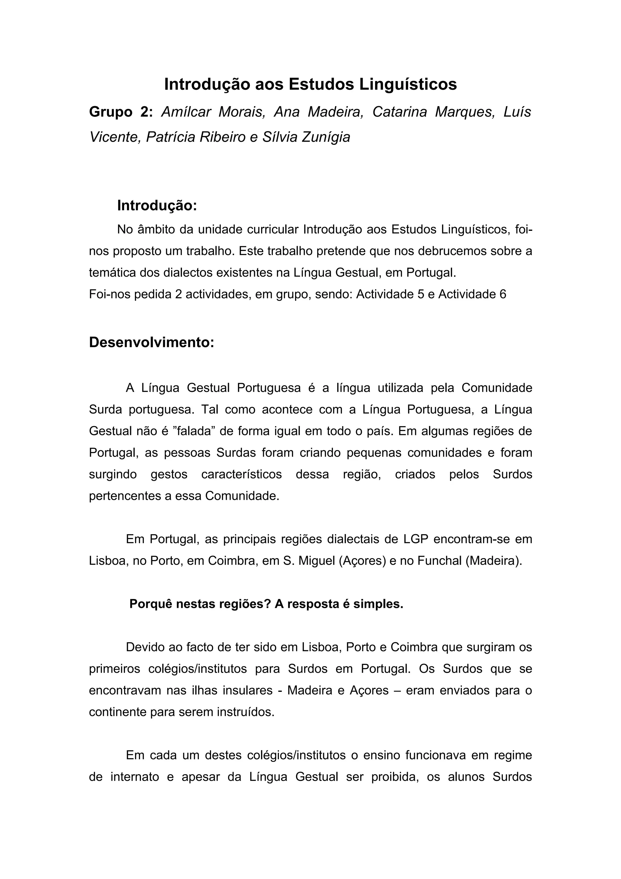 Este documento descreve os principais dialectos da Língua Gestual Portuguesa em Portugal, incluindo Lisboa, Porto, Coimbra, Açores e Madeira. Ele fornece exemplos de 20 gestos com significados iguais mas formas diferentes nestes dialectos e descreve as configurações manuais e movimentos de cada gesto.