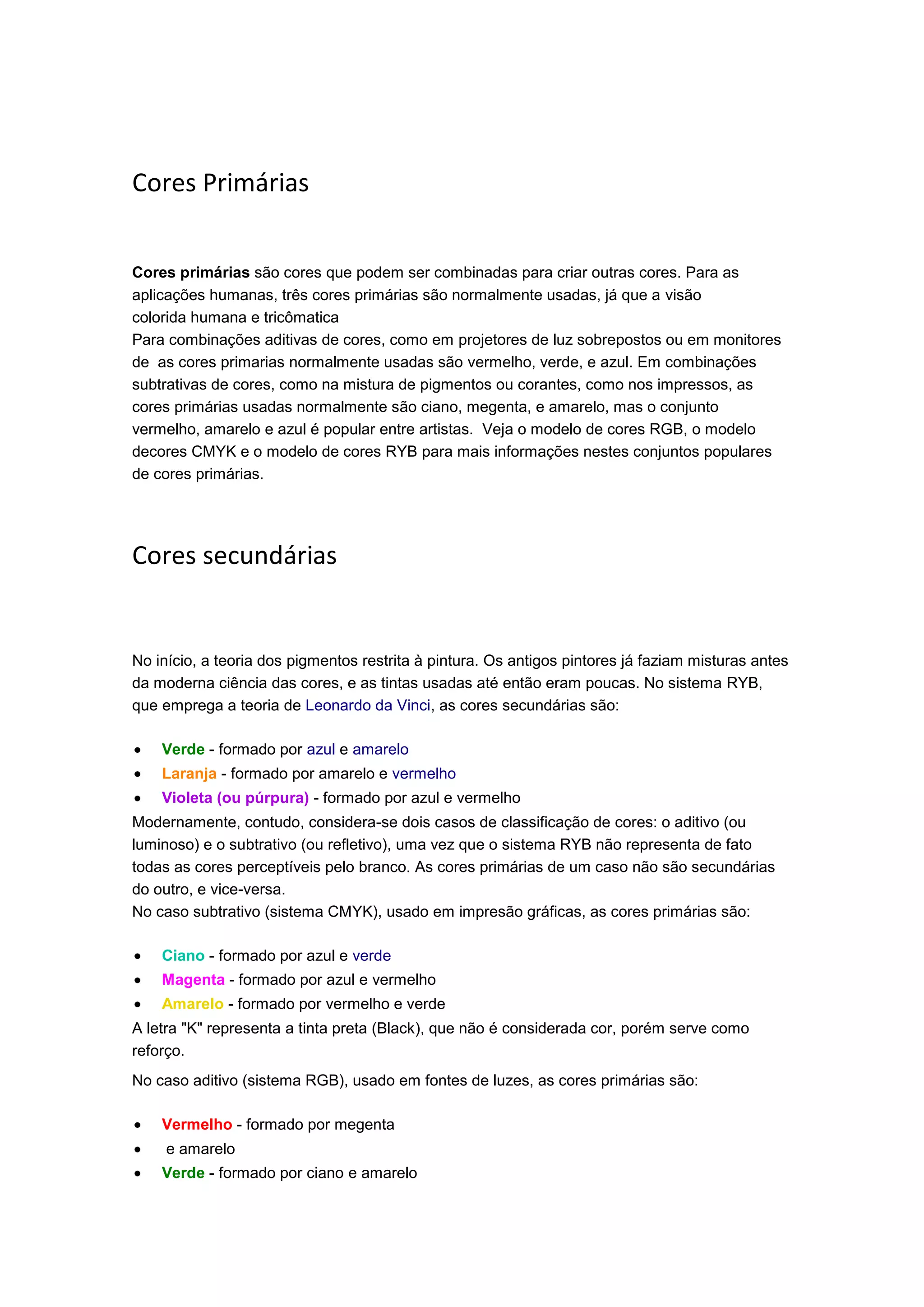 O documento descreve as cores primárias e secundárias. As cores primárias podem ser combinadas para criar outras cores. No modelo aditivo, as cores primárias são vermelho, verde e azul, enquanto no modelo subtrativo são ciano, magenta e amarelo. As cores secundárias são formadas pela mistura de duas cores primárias, como verde da mistura de azul e amarelo.