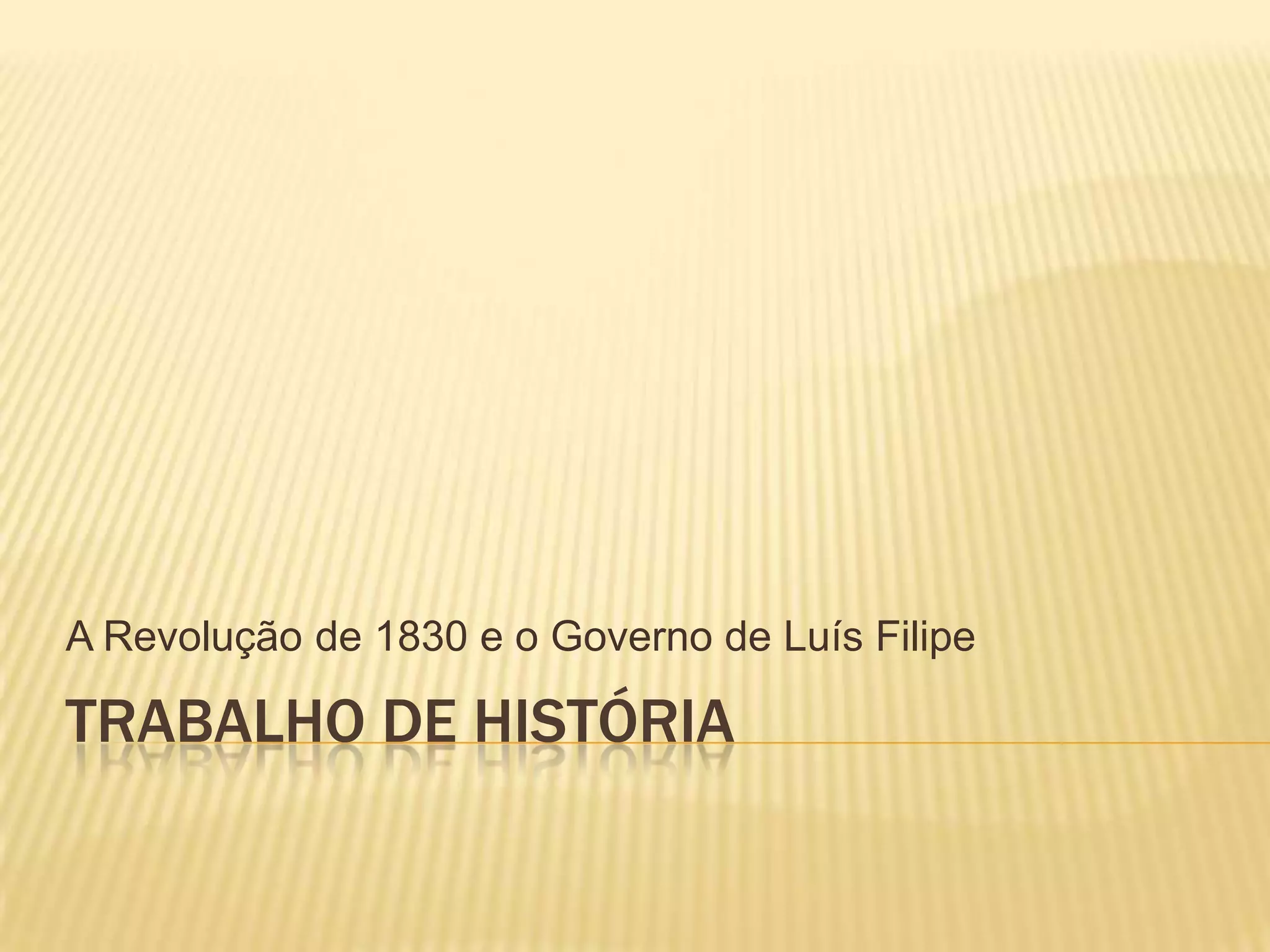 O documento resume a Revolução de 1830 na França que derrubou Carlos X e levou Luís Filipe ao poder. Carlos X restabeleceu o absolutismo do Antigo Regime, gerando oposição liberal liderada por Luís Filipe. As Jornadas Gloriosas de 1830 forçaram a fuga de Carlos. Luís Filipe se tornou rei, mas manteve restrições ao voto que geraram protestos, culminando na Revolução de 1848 e na Primavera dos Povos.