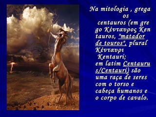 Na mitologia , grega os centauros (em grego Κένταυρος Kentauros, "matador de touros", plural Κένταυρι Kentauri; em latim Centaurus/Centauri) são uma raça de seres com o torso e cabeça humanos e o corpo de cavalo.