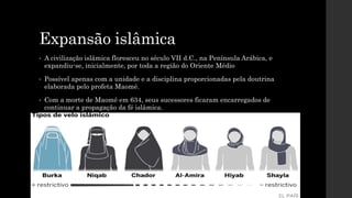 O documento resume a expansão inicial do Islã no século VII d.C. na Península Arábica e Oriente Médio, e discute as origens das divisões entre xiitas e sunitas após a morte do profeta Maomé.
