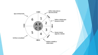 O documento descreve o ciclo PDCA, uma ferramenta de qualidade utilizada para solução de problemas em quatro etapas: planejar (P), fazer (D), verificar (C) e agir (A). Cada etapa do ciclo visa melhorar continuamente os processos à medida que os problemas são identificados e resolvidos, levando o sistema a um patamar superior de qualidade. O documento fornece detalhes sobre como o PDCA funciona e como ele pode ser aplicado no processo de garantia da qualidade.