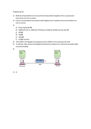O documento discute redes de computadores, definindo-as como um conjunto de computadores ligados entre si que podem se comunicar. Detalha que quando os computadores estão ligados, podem se comunicar uns com os outros. Fornece também exemplos de preços de itens para redes como cabos e roteadores. Explica a diferença entre uma rede local (LAN) e uma rede ampla (WAN), e os benefícios de uma rede por cabo em relação a uma rede sem fio.