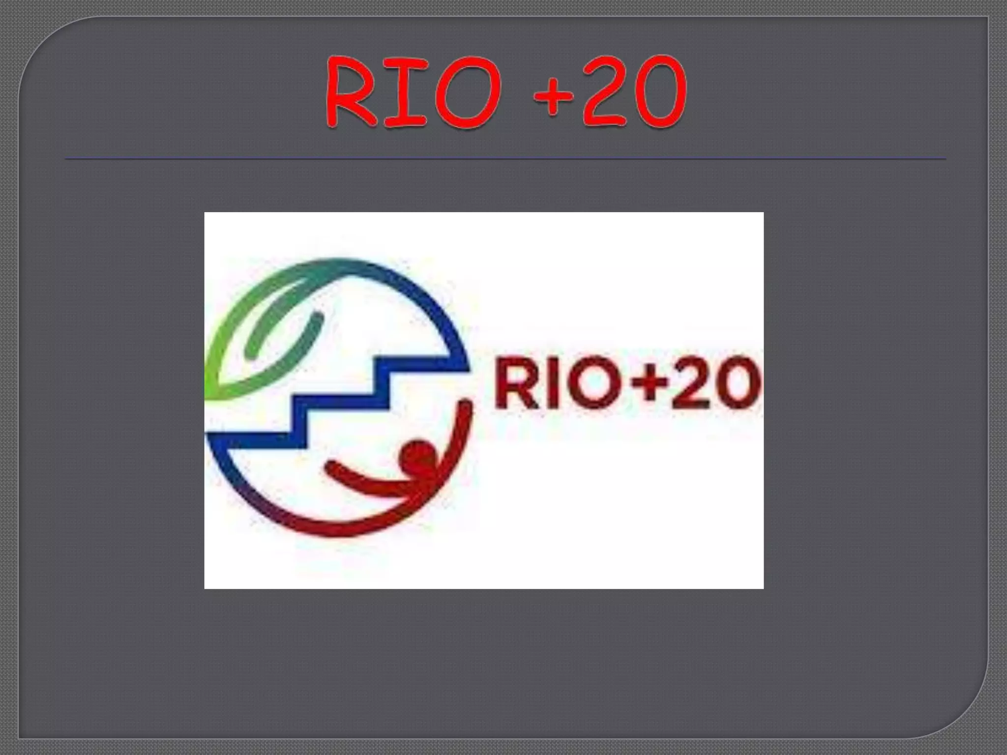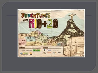A conferência Rio+20 ocorre no Brasil em 2012 para discutir o desenvolvimento sustentável mundial 20 anos após a Eco-92, com foco em reduzir a pobreza através de economia verde e programas sociais para as próximas décadas.