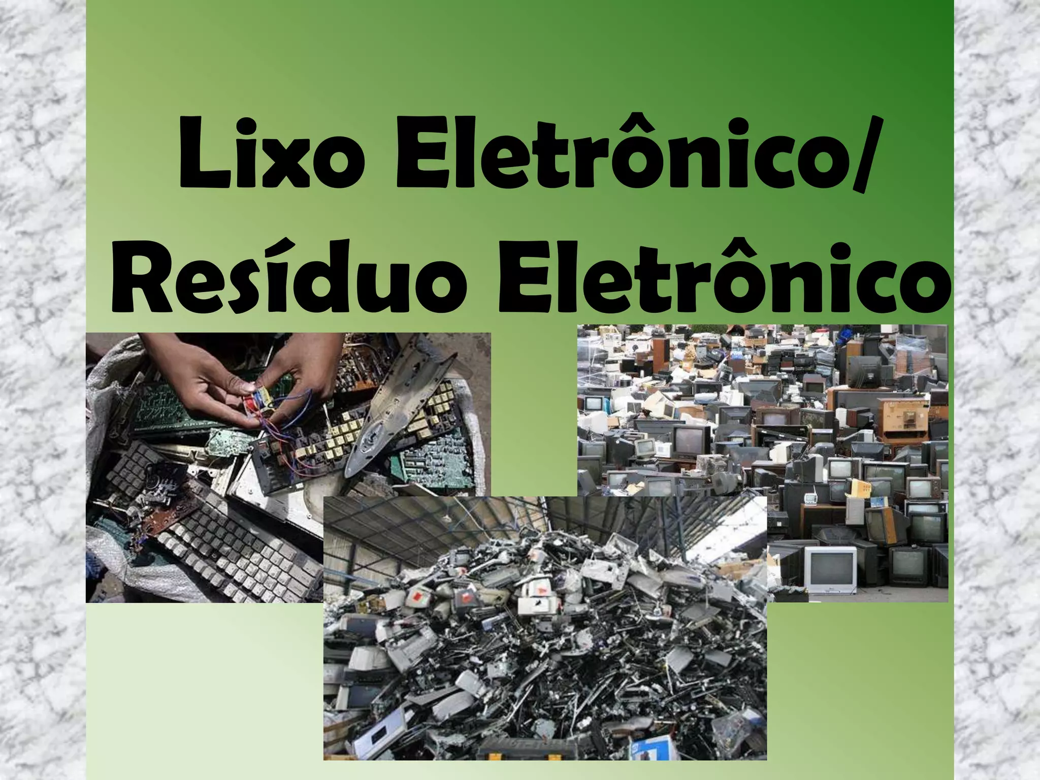 O documento discute o lixo eletrônico, definindo-o como resíduos de equipamentos eletrônicos e destacando que é um grande problema ambiental quando descartado incorretamente. Também aborda a rapidez na troca de equipamentos, os problemas causados pelo descarte indevido e as opções de descarte correto.