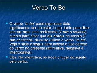 O documento apresenta as semelhanças e diferenças entre o verbo "to be" e verbos regulares no simple present. Discute a conjugação do verbo "to be" na afirmativa, negativa e interrogativa e fornece exemplos. Também explica a formação do passado para verbos regulares e compara com o verbo "to be".