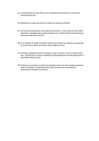 O documento discute diferentes tipos de medidores de vazão e quantidade, incluindo medidores de peso, volume, placa de orifício, tubo Venturi, bocal de vazão, tubo Pitot e rotâmetro. Também menciona medidores ultrassônicos, Parshall e magnéticos.