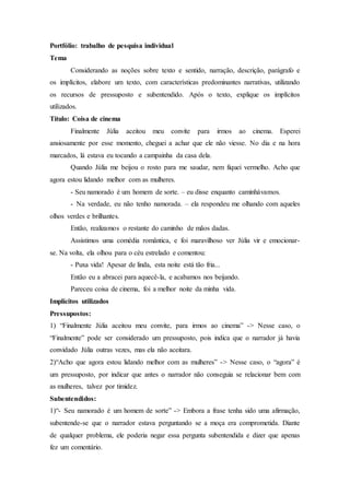 Este documento resume um texto narrativo escrito por Luci Cavalcante para uma tarefa de interpretação e produção de texto. O texto narra uma noite em que o narrador convida Júlia para irem ao cinema e acaba se tornando a melhor noite de sua vida. O resumo explica dois pressupostos e dois subentendidos usados no texto narrativo.