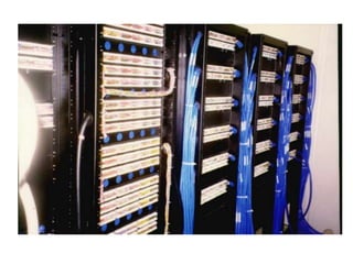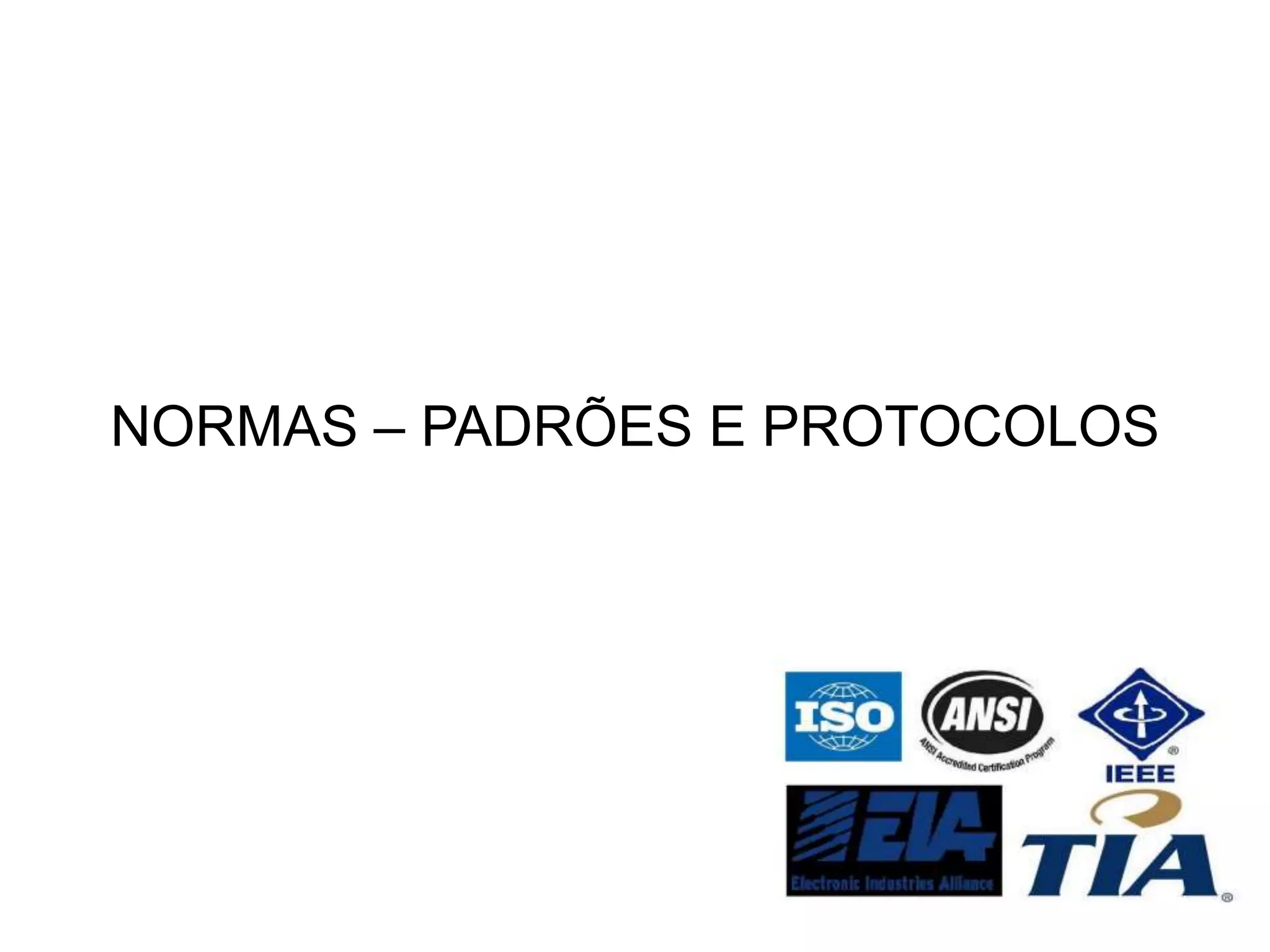 O documento discute normas e padrões para infraestrutura de rede e data centers. Ele define normas, padrões e protocolos e descreve requisitos para sala de equipamentos, cabeamento vertical e horizontal, elementos horizontais e modelos de referência para rede. Também discute normas para data centers incluindo infraestrutura de rede, segurança física, combate a incêndio e arrefecimento.
