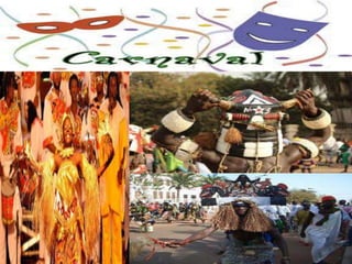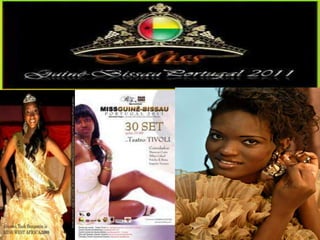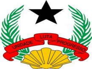 O documento fornece um resumo histórico, geográfico e cultural da Guiné-Bissau, desde a sua colonização por Portugal nos séculos XV-XIX até a independência em 1974. Aborda tópicos como a diversidade étnica, a luta pela independência, a economia baseada na pesca e agricultura, as artes, a música, a dança e as dificuldades atuais como a pobreza e fome.