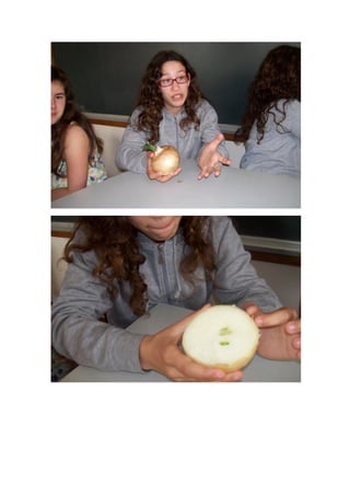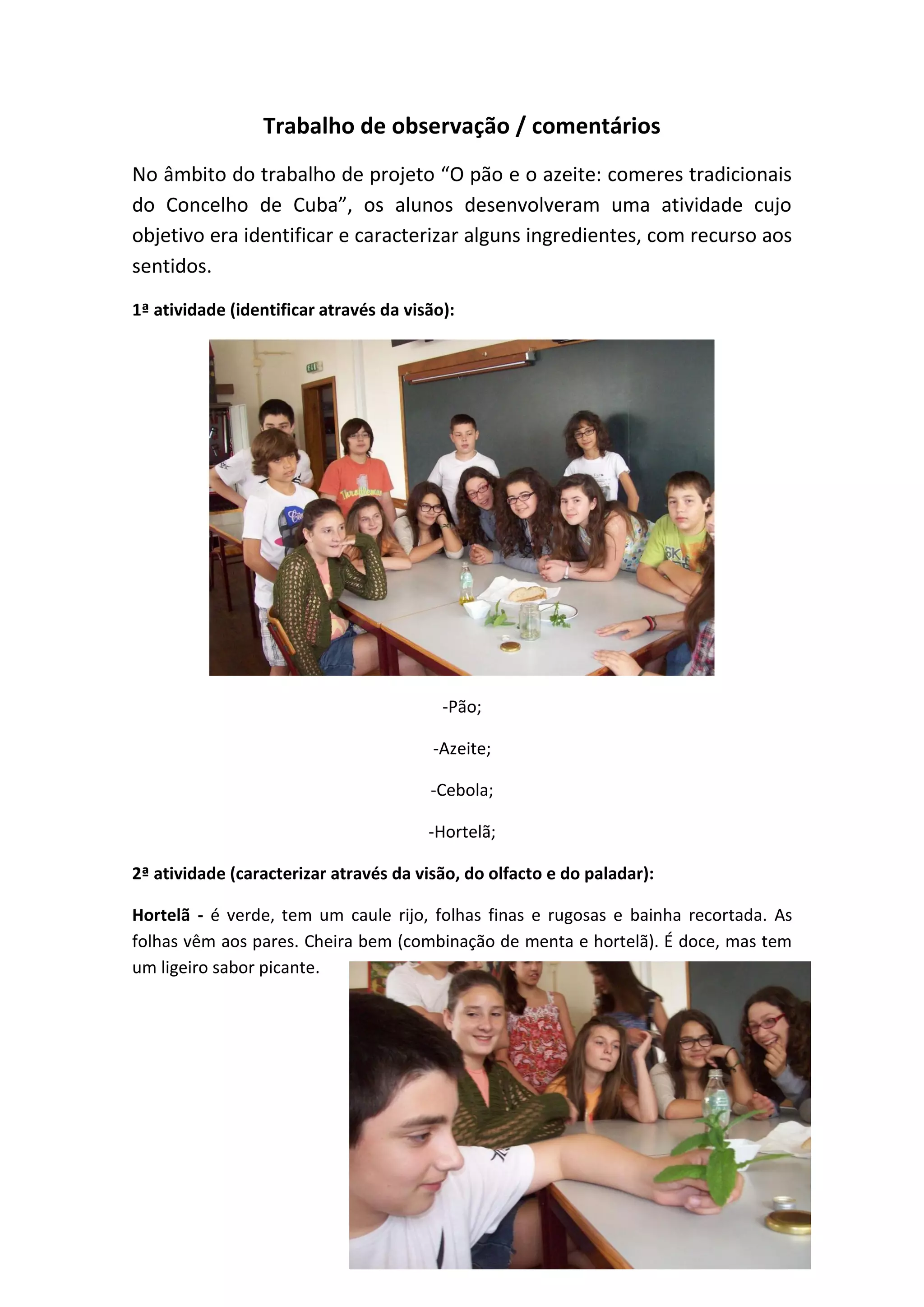 Os alunos identificaram e caracterizaram ingredientes tradicionais portugueses como o pão, azeite, cebola e hortelã usando os sentidos da visão, olfato e paladar. Eles descreveram as aparências, cheiros e sabores de cada ingrediente.