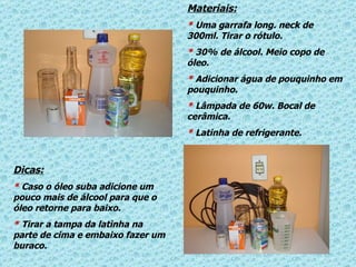 O documento descreve um experimento de química sobre as propriedades de mistura de álcool, óleo e água. Ele fornece instruções para colocar esses três líquidos em uma garrafa e aquecê-la com uma lâmpada, observando como o óleo sobe e desce devido a sua temperatura de ebulição diferente.