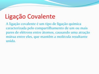 A ligação covalente é caracterizada pelo compartilhamento de elétrons entre átomos, causando atração mútua que mantém as moléculas unidas. Ela ocorre tipicamente entre não-metais e hidrogênio, como no caso da molécula H2 onde cada átomo de hidrogênio compartilha seu único elétron. Ligação covalente pode ser apolar, entre átomos iguais, ou polar, entre átomos diferentes como no caso da molécula H2O.