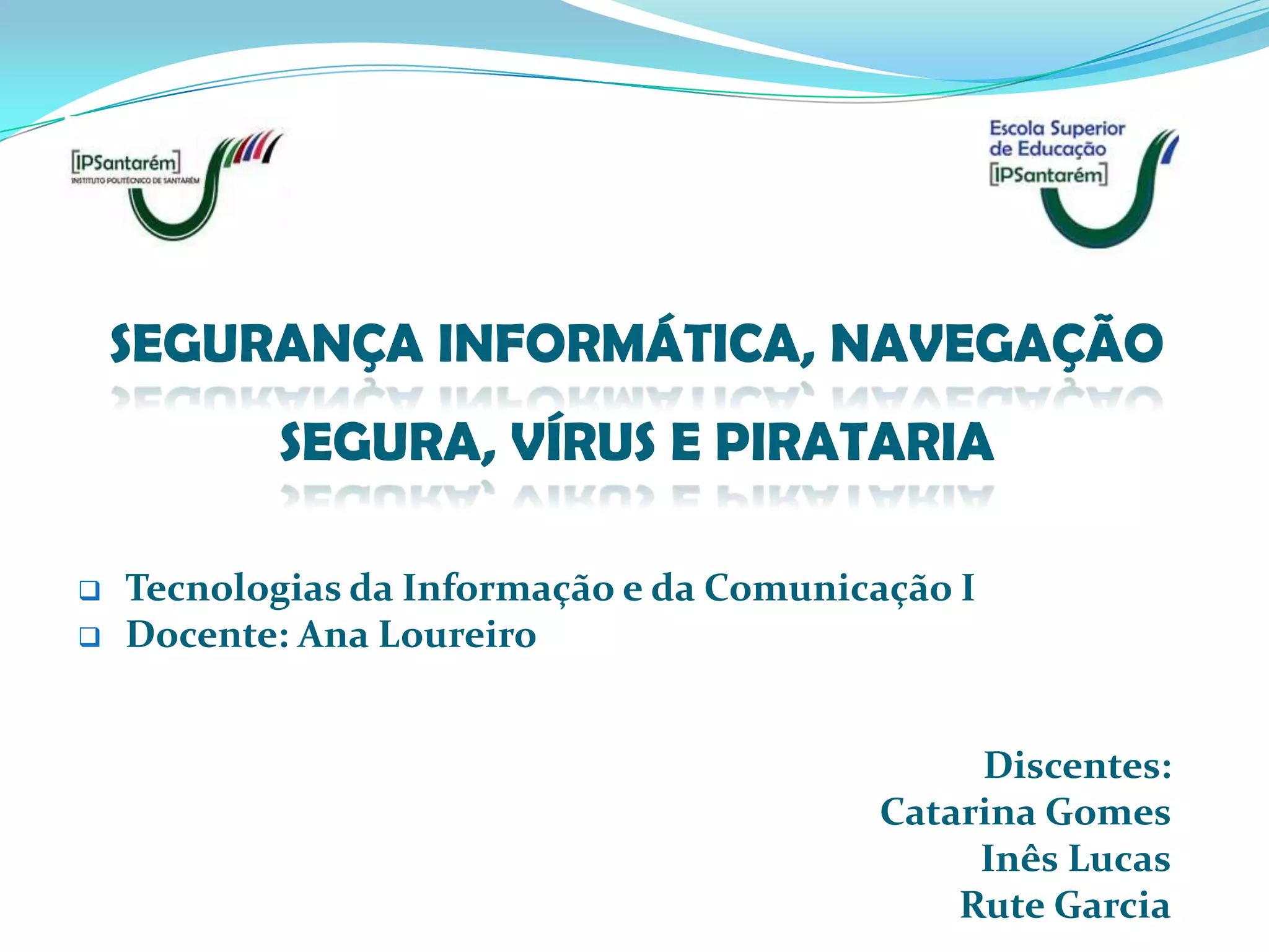 O documento aborda a segurança informática, incluindo a proteção de dados, objetivos como confidencialidade, integridade e disponibilidade, além de mecanismos de controle de acesso. Também discute a navegação segura, apresentando dicas para evitar ameaças e vírus informáticos, que são programas que se replicam sem o conhecimento do usuário. Por fim, menciona a pirataria como a reprodução ilegal de conteúdo protegido por direitos autorais.
