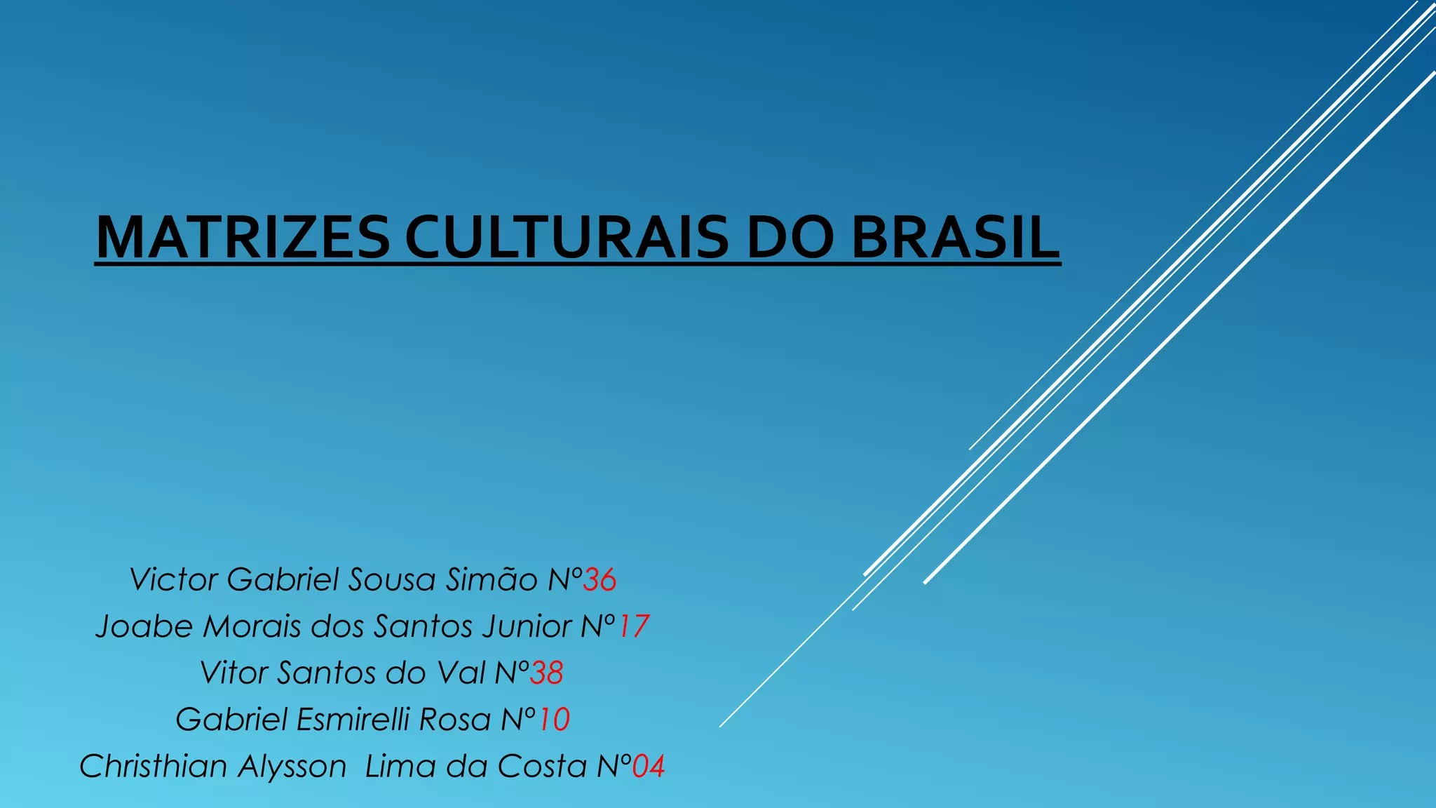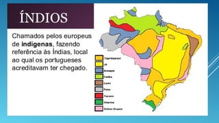 O documento descreve as matrizes culturais do Brasil, incluindo as culturas indígena e europeia (portuguesa). A cultura indígena influenciou a música, folclore, artesanato e culinária brasileira. Alguns grupos indígenas praticavam canibalismo ritualístico e tinham religiões que envolviam espíritos da natureza. Os portugueses trouxeram tradições como as cavalhadas, que recriam torneios medievais.