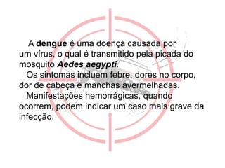 A dengue é uma doença viral transmitida pela picada do mosquito Aedes aegypti, causando sintomas como febre alta e dores no corpo. Não possui tratamento específico, sendo o foco na prevenção evitando a proliferação do mosquito, principalmente removendo água parada que serve de criadouro.