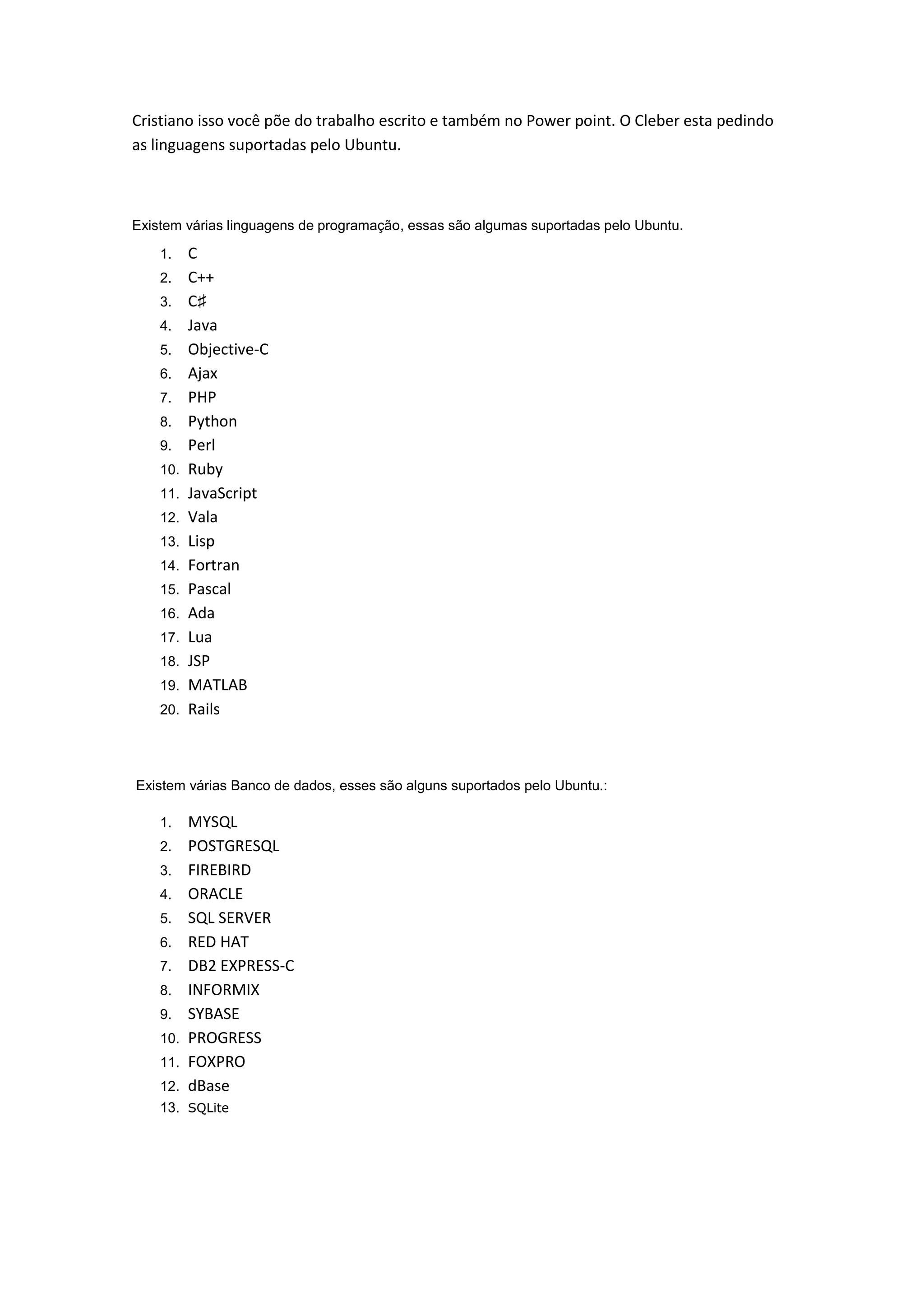 O documento lista as principais linguagens de programação e bancos de dados suportados pelo sistema operacional Ubuntu, incluindo C, C++, Java, Python, MySQL, PostgreSQL e Oracle. Ele também fornece referências sobre o Ubuntu.