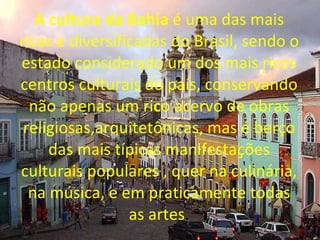 A cultura da Bahia é uma das mais ricas do Brasil, com tradições musicais, culinárias e religiosas diversificadas. A música popular baiana como o samba de roda influenciou o país, enquanto nomes como Dorival Caymmi e Gilberto Gil tiveram sucesso internacional. O Carnaval de Salvador e as festas afro-brasileiras como o Candomblé também são importantes expressões culturais.