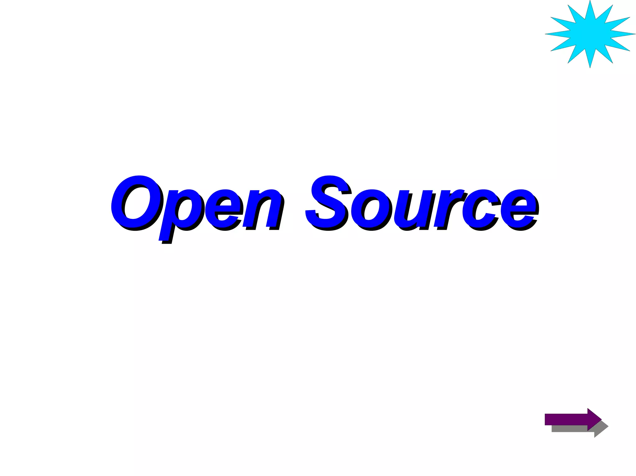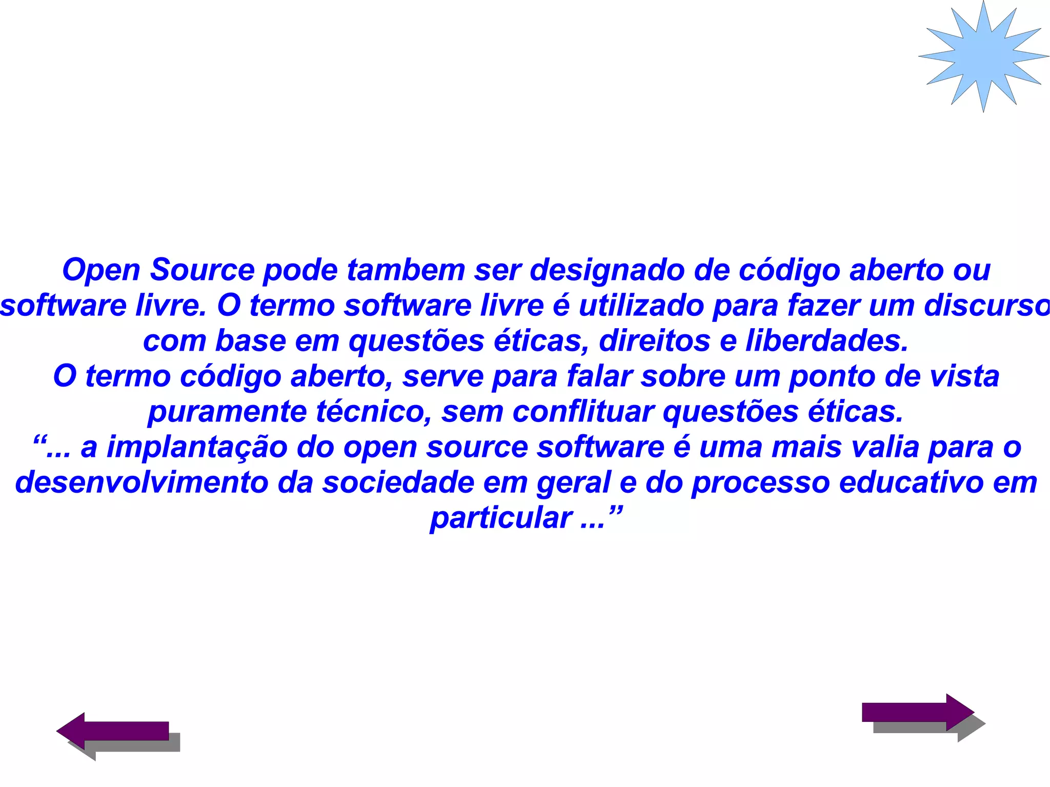 O documento discute open source, definindo-o como software livre ou código aberto. Ele destaca as vantagens econômicas, técnicas e pedagógicas do open source na educação, embora reconheça que algumas pessoas também veem desvantagens. O documento usa o navegador Mozilla Firefox como um exemplo bem-sucedido de aplicação open source.