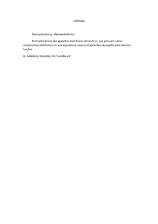 O documento fornece uma definição de eletroeletrônicos como aparelhos eletrônicos domésticos com vários componentes eletrônicos. Ele também resume a história dos eletroeletrônicos, desde a invenção do telégrafo por Samuel Morse em 1835 até o desenvolvimento de rádios, geladeiras e TVs no século XX à medida que a tecnologia de válvulas e semicondutores avançava, levando a aparelhos cada vez mais sofisticados.