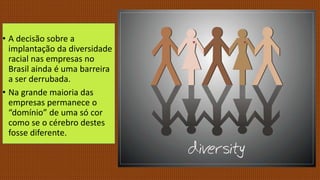O documento discute os benefícios da gestão da diversidade racial nas empresas brasileiras. Ele argumenta que a diversidade é um diferencial competitivo importante devido à concorrência no mercado e pode resultar em maior inovação e compreensão do mercado consumidor. No entanto, é necessário que as empresas criem um ambiente de respeito mútuo para que as diferenças sejam compreendidas e haja harmonia entre os funcionários.